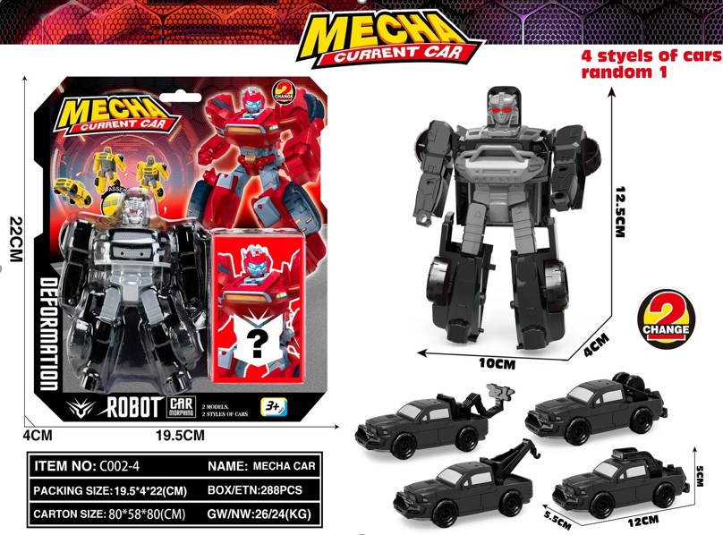 Размер: 12*5,5*5 см (машина), 10*4*12,5 см (робот)Материал: пластикЦвет: черныйДетали: машинка-трансформерУпаковка: европодвес