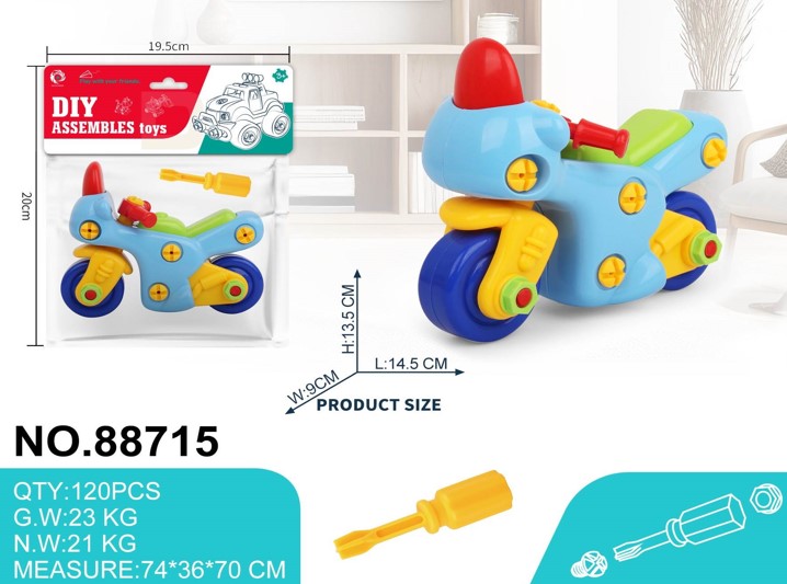 Размер: 14,5*9*13,5 смМатериал: пластикЦвет: ассортиКомплектация: мотоцикл + отверткаУпаковка: европодвес