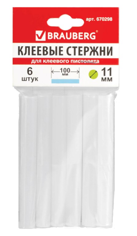 Клеевые стержни BRAUBERG 11 мм, длина 100 мм, 6 шт, белые, 670298
