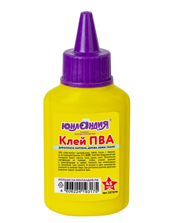 Клей ПВА 45г ЮНЛАНДИЯ, 227379, (бумага, картон, дерево)