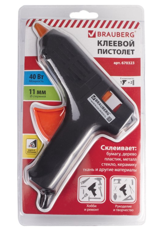 Клей-пистолет BRAUBERG 40 Вт, 11 мм, блистер, 670323