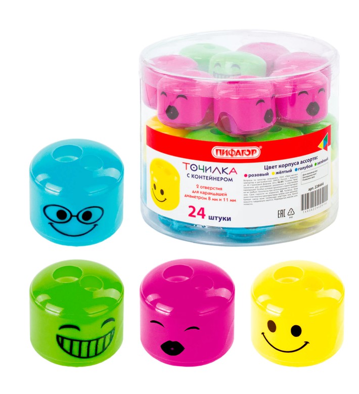 Точилка ПИФАГОР 2отв., контейнер, пластиковая, ассорти, 228444