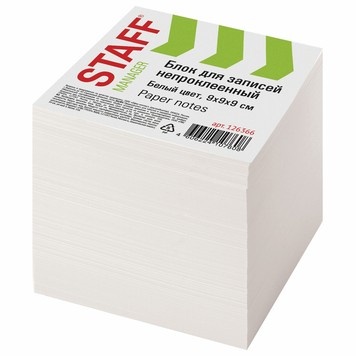 Блок для заметок 9*9*9 белый,STAFF,126366