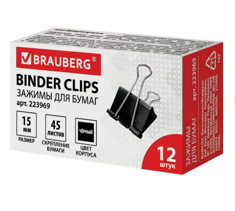 Зажим канцелярский для бумаг 15мм на 45 листов BRAUBERG черн. 223969
