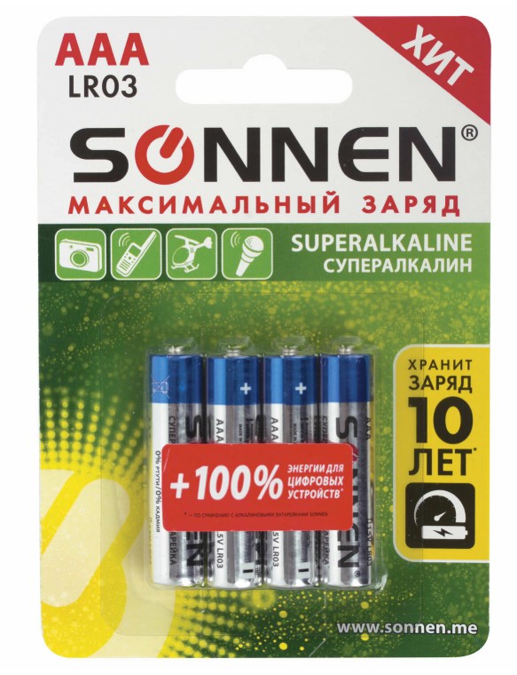 Батарейка SONNEN AAA (LR03), 4шт, 1.5В, 451096