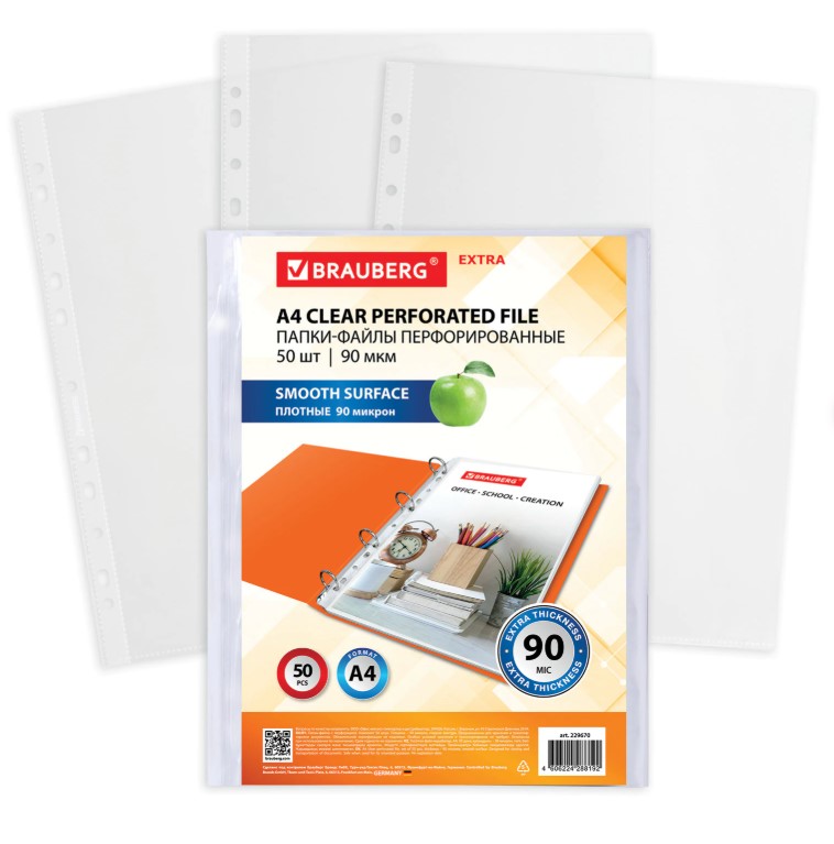 Папка-файл А4 90 мкм, BRAUBERG, 50шт гладкие, перфорир, 229670