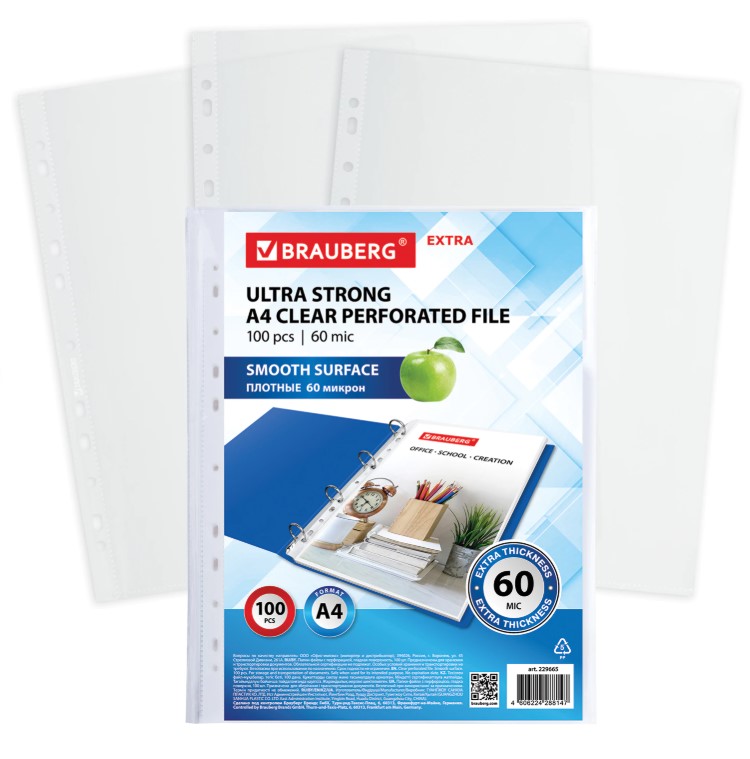 Папка-файл А4 60 мкм, BRAUBERG 100шт гладкие, перфорир, 229665